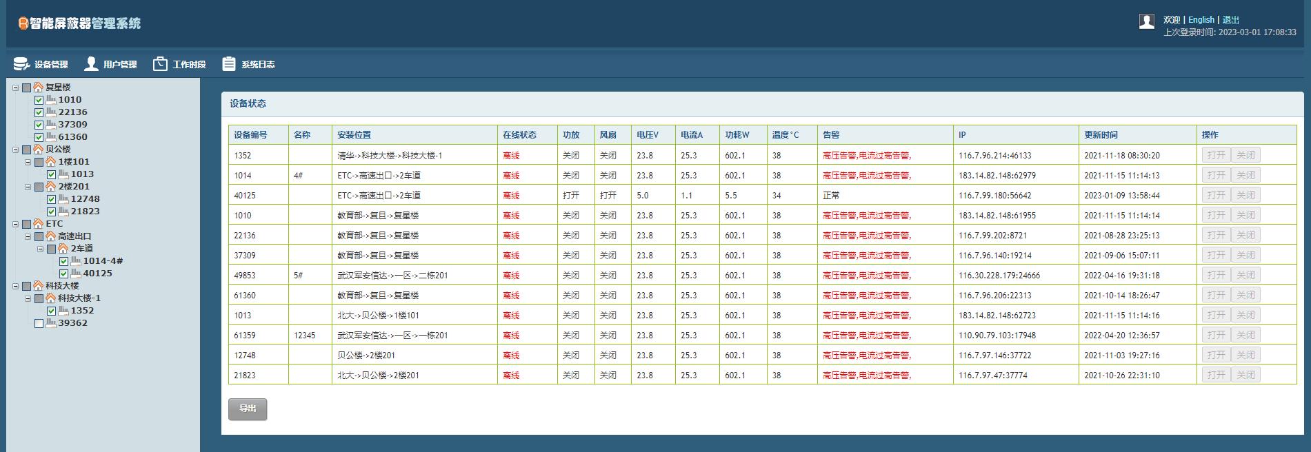 - 智能屏蔽管理系統(tǒng)列表狀態(tài)下實時顯示所有上線及待機狀態(tài)下的智能屏蔽器的工作電壓電流。