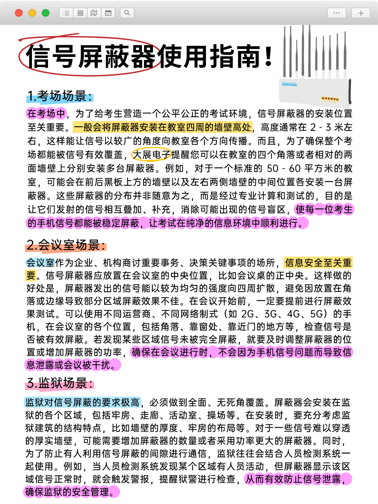 這些場景中,信號(hào)屏蔽器就像一位位隱形衛(wèi)士,悄無聲息地維護(hù)著秩序與安全。但不知道大家有沒有想過,這些看似不起眼的設(shè)備,究竟能在多大范圍內(nèi)發(fā)揮作用呢?它們的屏蔽范圍又受哪些因素影響?今天,大展電子帶著大家深入探尋信號(hào)屏蔽器范圍的奧秘 。