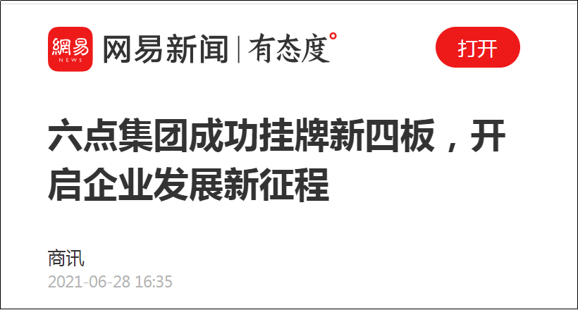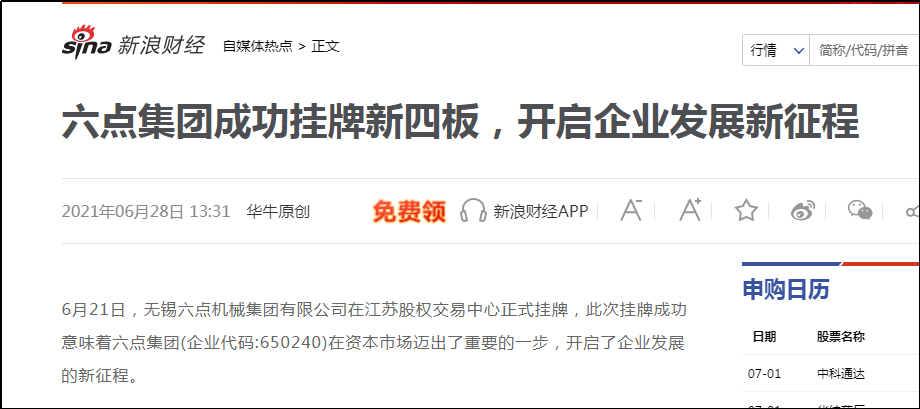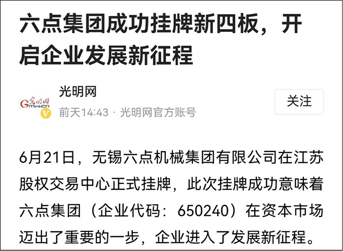 2021年6月21日,無錫六點機械集團有限公司正式掛牌新四板,企業代碼:681294,吊籃租賃領域掛牌新四板的企業橫空出世,多家新聞網站競相報道。六點集團用6年的時間,從默默無聞到行業黑馬,成為了大家關注的焦點,連主流媒體光明網、新浪財經、網易財經等門戶網站也發文報道。