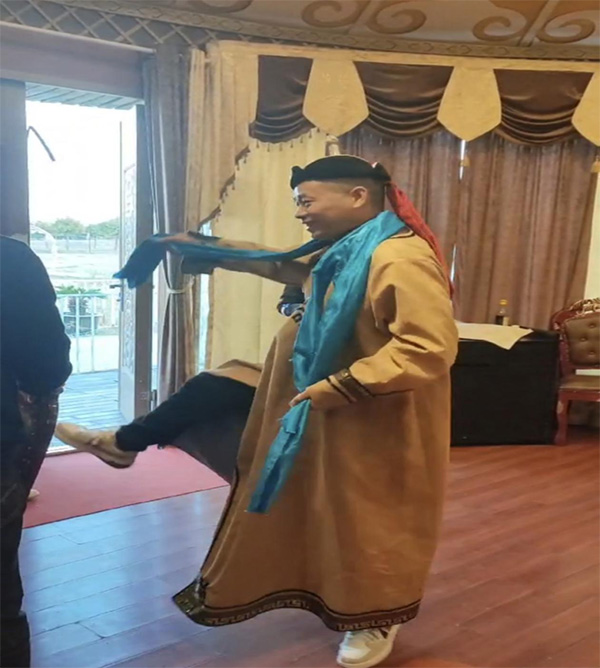 在空巴晚宴上,大家體驗到了專業(yè)的蒙古族烤全羊開羊儀式。當烤全羊上席時,香氣四溢,掌聲四起,工作人員為大家獻上了藍色的哈達,表達對大家的熱烈歡迎。